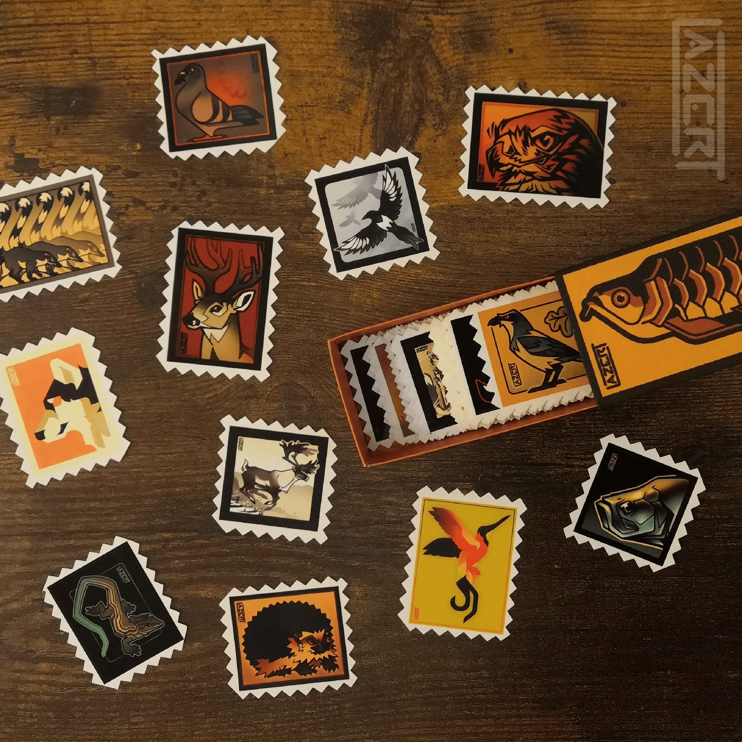 Handmade matchboxes with a stylized arowana design, containing the full Series 1 and Series 2 of my vinyl stamp-style stickers, a total of 60 different stickers!